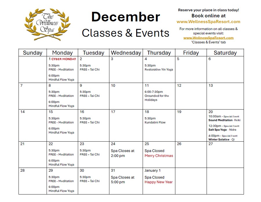 Schedule: Thursdays: Sept 25, Oct 23, Nov 20, Dec 18 – 5:30 pm – 6:30 pm at The Wellness Spa.